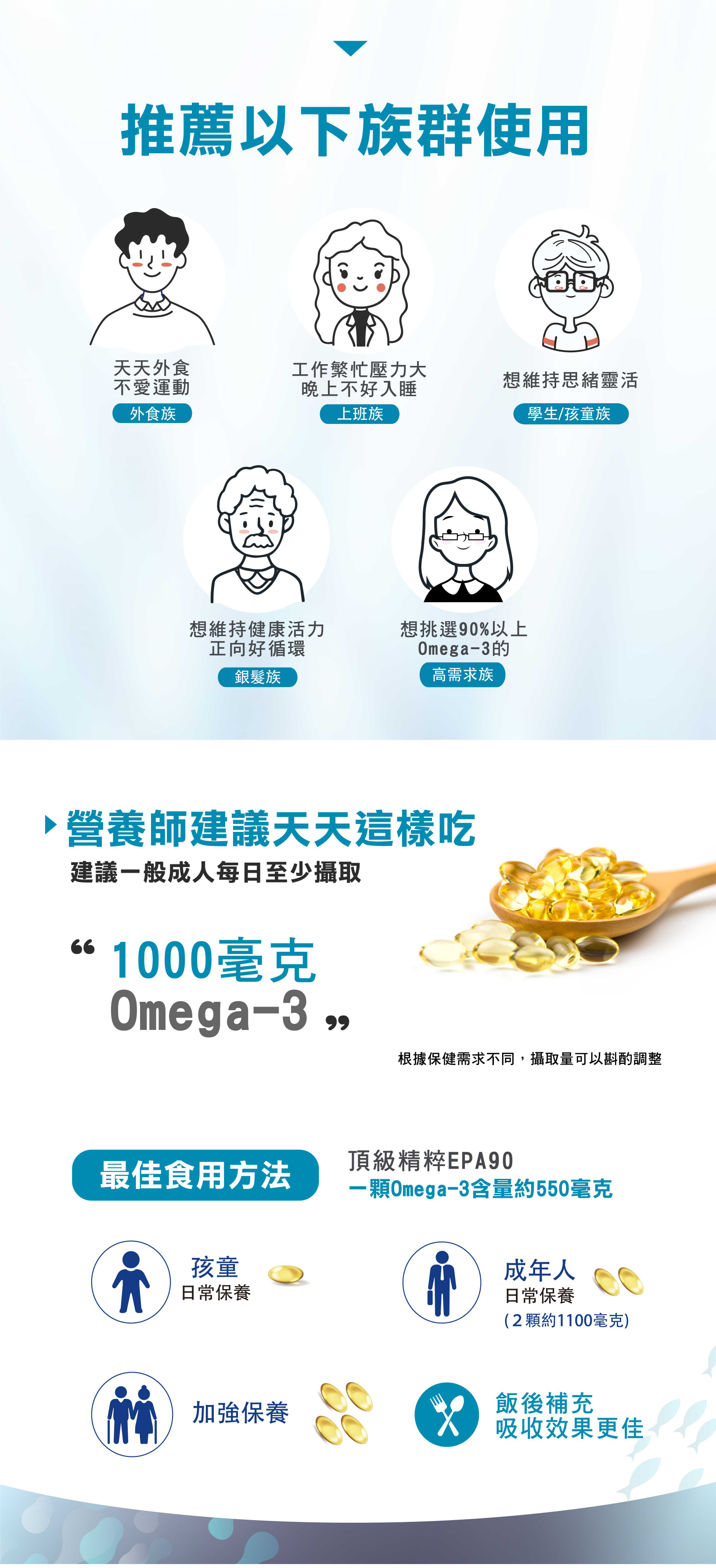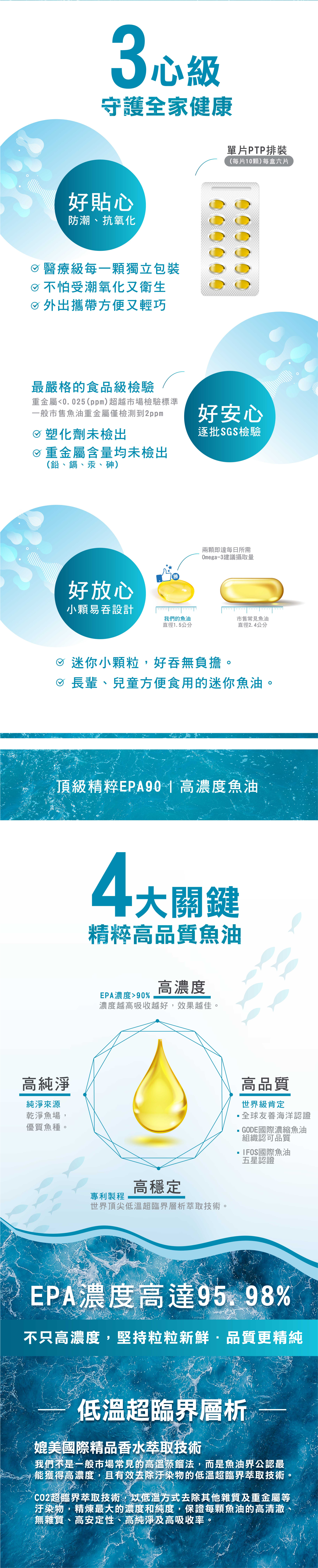 - 首款專為特別營養需求族群研發的EPA濃度超過90%魚油