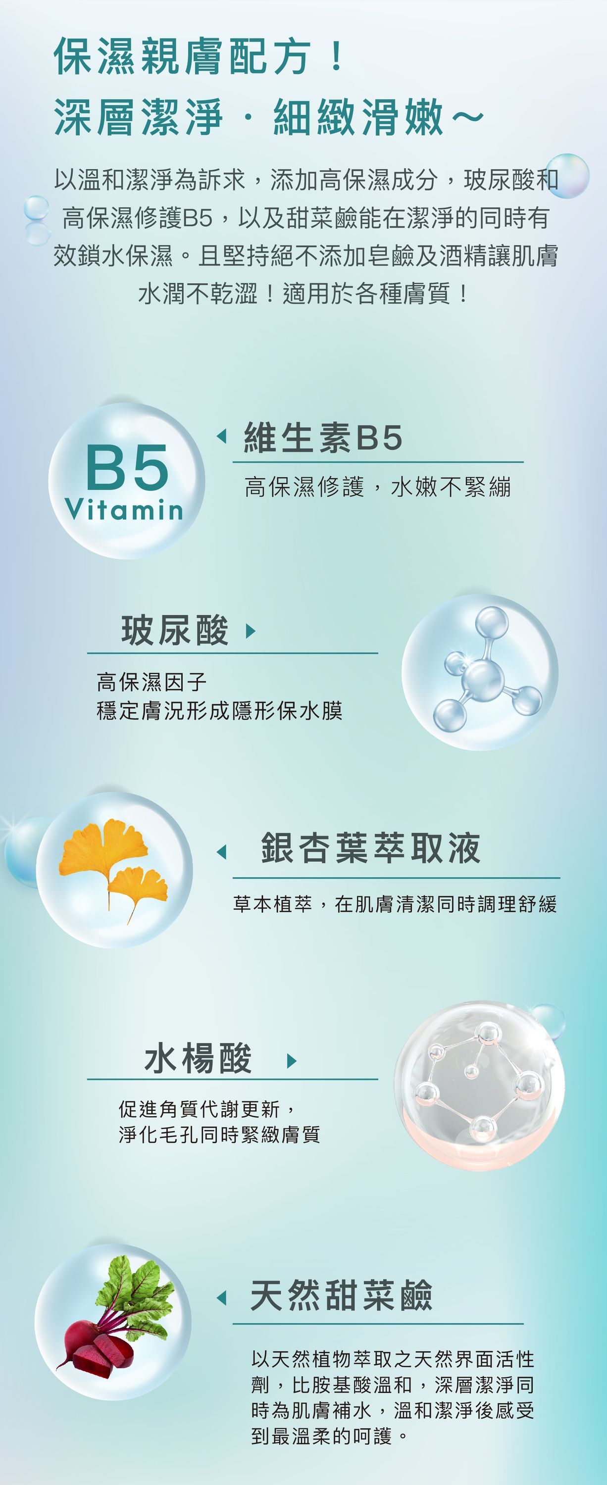 以溫和潔淨為訴求,添加高保濕成分如玻尿酸鈉和高保濕修護維生素原B5,以及溫和的甜菜鹼,能在潔淨的同時有效鎖水保濕。