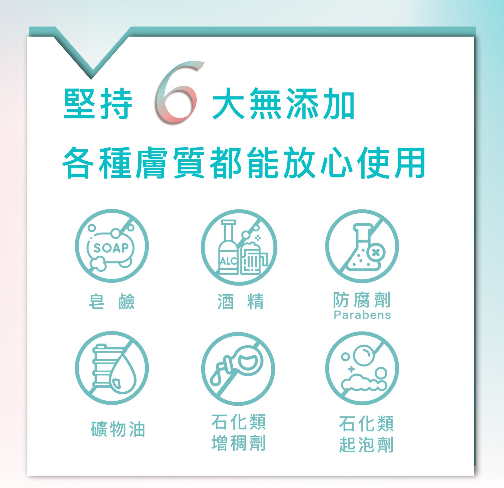 我們堅持絕不添加皂鹼及酒精,讓洗後肌膚觸感柔軟、水潤而不乾澀緊繃,適用於各種膚質,無論季節轉換時期,都可以安心使用。