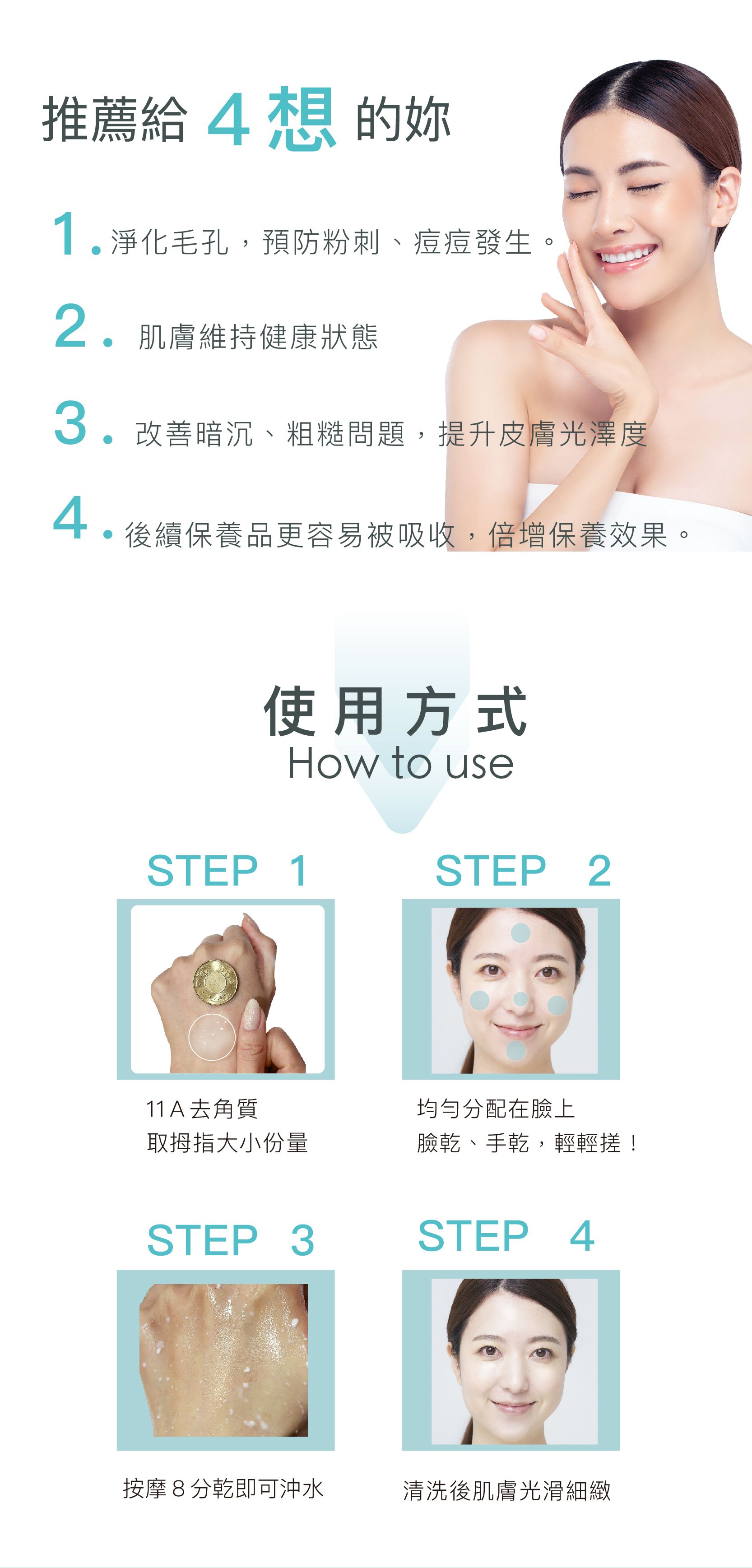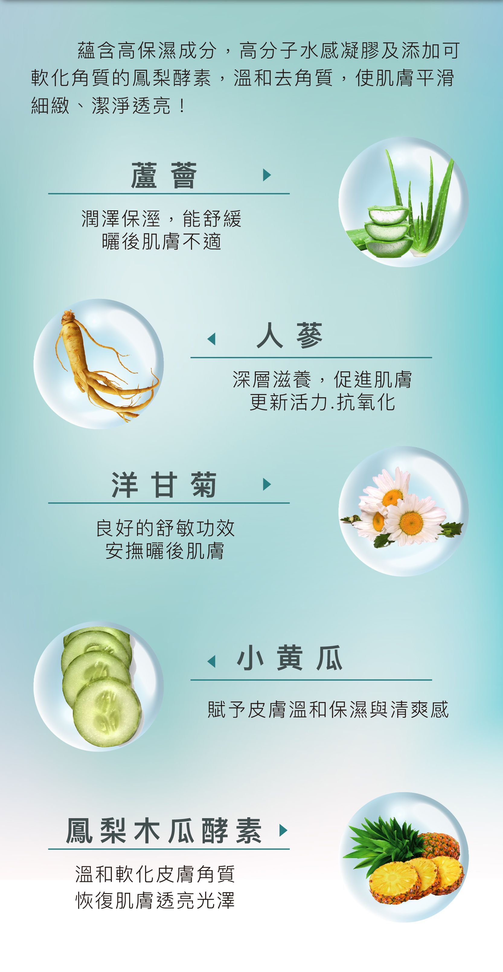 蘊含高保濕成分,高分子水感凝膠及添加可軟化角質的鳳梨酵素溫和去角質,使肌膚平滑細緻、潔淨透亮!